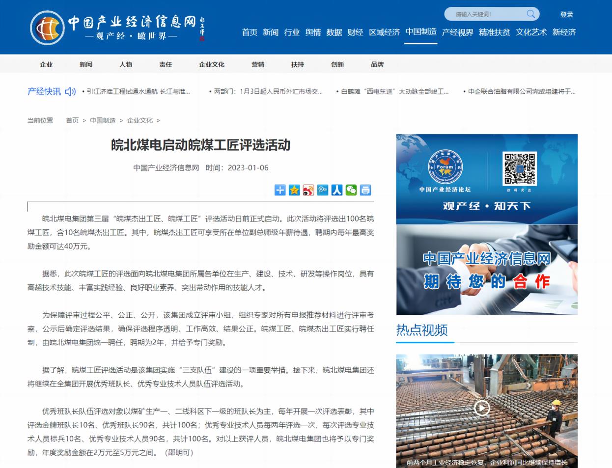 1月6日中國產(chǎn)業(yè)經(jīng)濟(jì)信息網(wǎng):皖北煤電啟動皖煤工匠評選活動